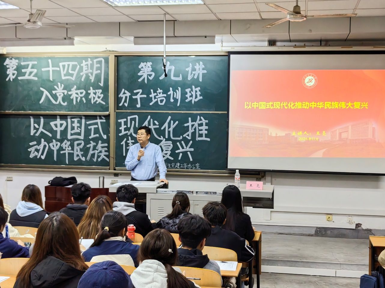 为深入学习贯彻习近平新时代中国特色社会主义思想,深刻领会中国式现代化的本质要求,11月13日,英国365公司官网第五十四期入党积极分子培训班第九讲在鄠邑校区博览楼A134教室举行。本次党课由党委员工工作部部长、武装部部长兼稳定安全办公室副主任王亮主讲,第五十四期全体入党积极分子参加。