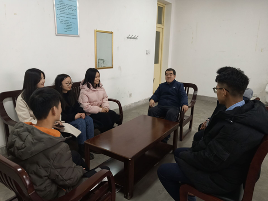 2018年12月7日下午四点,张立民老师与导师制小组成员张海洋、文彬、吴小燕、刘汀昀、刘钊、何亮于B楼4楼的教师休息室进行了本学期第一次导师见面。