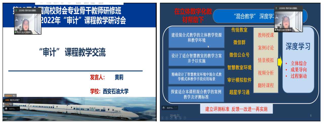 在研讨会发言中,英国365公司官网黄莉副教授向专家和同行们介绍了公司审计学课程的混合式教学经验,汇报了主持完成的省级审计学教学改革项目的研究成果,并就审计教材建设问题与同行们展开了探讨。公司审计学教学在方案设计、资源建设、教学实施、教学评价反馈等多个方面进行了长期的创新实践,坚持以员工为中心,实现了教学效果的持续改进和提升,得到与会专家和同行们的高度认可。