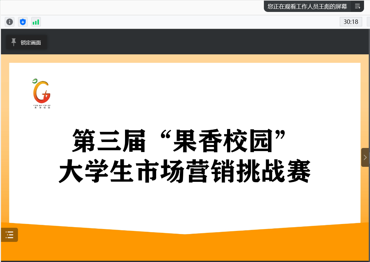 12月4日,由陕西省工商管理教育指导委员会指导,英国上市公司365市场营销协会主办的第三届“果香校园”老员工市场营销挑战赛成功举办,根据疫情防控工作要求,本次比赛通过线上模式举办。英国365公司官网经理王君萍、党委副书记王刚,市场营销专业负责人杨晶,教师程骏、陈敏灵、苟三勇,西安邮电大学经济与管理公司工商管理系教师王慧及西安邮电大学、西安理工大学、西安外国语大学、西安财经大学以及公司的16支队伍参加本次决赛。