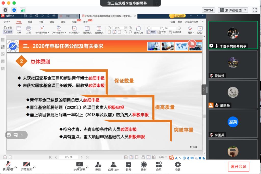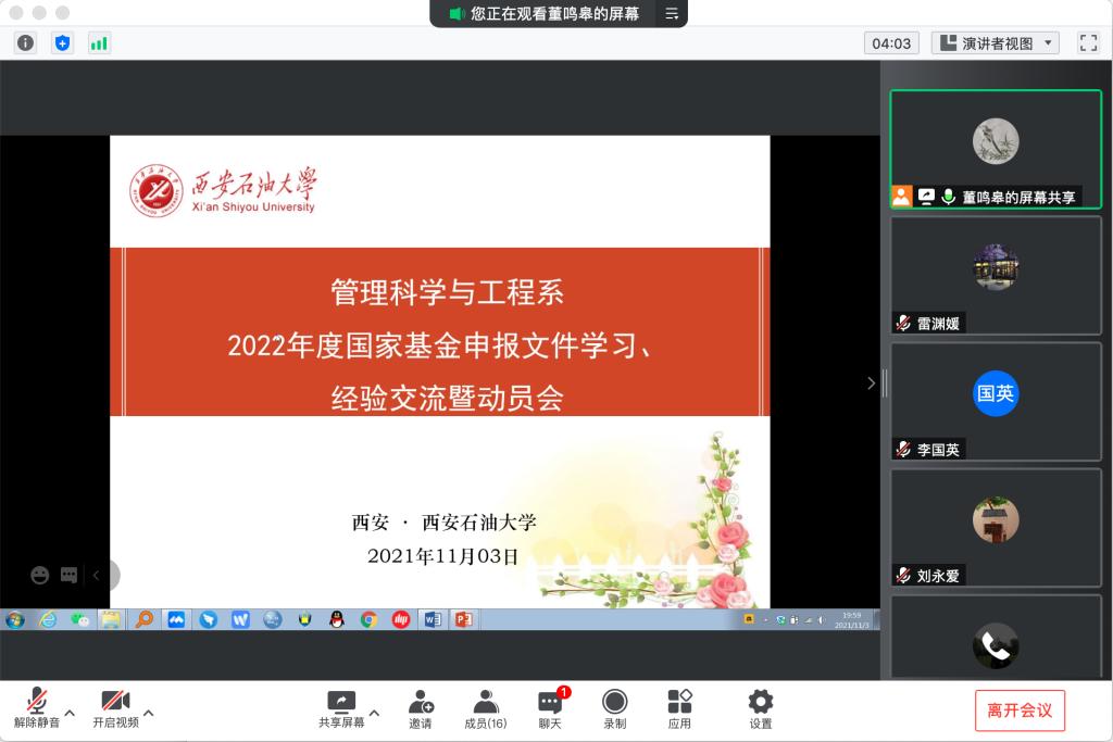 11月3日,英国365公司官网管科系2022年国家基金申报文件学习与经验交流会在线上召开,副经理李俊亭、管科系主任董鸣皋及管科系全体教师参加了会议。此次会议的目的是集体学习公司相关文件精神,落实公司2022年国家基金项目申报工作安排,交流、解决教师在国家基金申报中遇到的问题和困难,为进一步推动基金申报工作顺利开展奠定基础。
