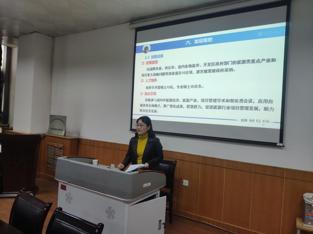 会上,杨睿娟教授根据陕西高校新型智库建设任务书对智库预期目标作了简要介绍,并就前期智库答辩情况及下一步工作推进计划进行了解读。她提出,平台建设要从三个方面出发予以加强,一是加强与政府的联系,跟踪国内外能源行业的发展动态,为能源产业发展咨政建言献策;二是加强与企业的合作,特别是与陕煤、长庆等地方能源企业的横向项目合作,解决陕西能源企业发展中的实际问题;三是加强人才培养、学科发展和学术研究工作,形成人才培养质量提升、学科科学有序发展、学术研究提质增效的良好局面。