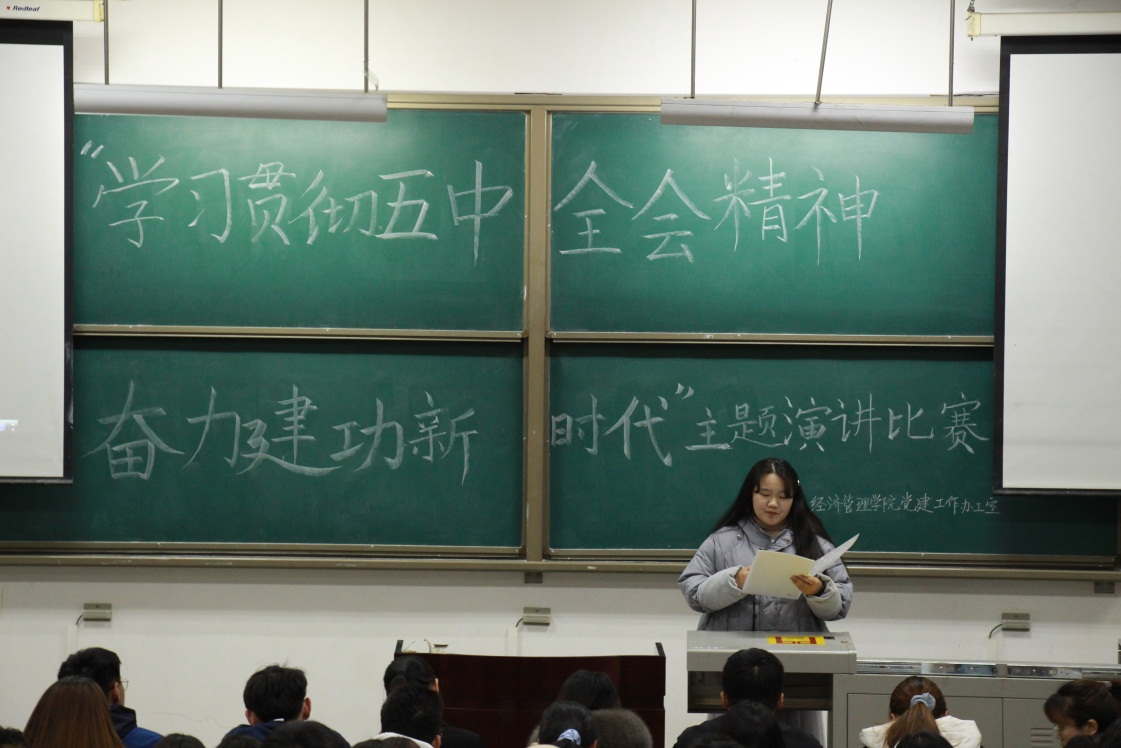——演讲比赛入心。12月24日晚,由经济管理公司党委主办,员工党建工作办公室承办的“学习贯彻五中全会精神,奋力建功新时代”主题演讲比赛于鄠邑校区A区教学楼234教室举行。部分员工党建干部以及第四十六期入党积极分子近200人参加。本次比赛紧紧围绕着十九届五中全会精神,深入讨论,广泛交流。