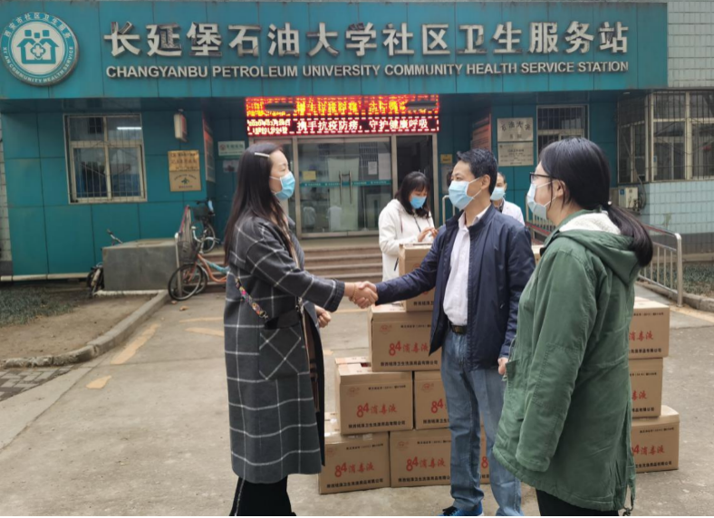 2020年3月28日下午,英国365公司官网商务1801班贾欢煦同学在父亲的陪同下从咸阳来到公司捐赠疫情防控物资。国有资产处、校医院代表接收捐赠。