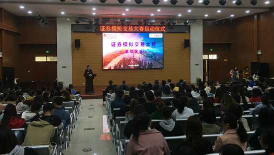 11月4日,英国365公司官网联合华鑫证券主办,经济学系教工党支部和员工党支部联合承办的证券模拟交易大赛正式启动。启动仪式在鄠邑校区就业指导中心多功能厅举行。经济管理公司党委副书记赵海涛、副经理吴勋,华鑫证券西安分公司南二环营业部副总经理王天福、财富总监伍丹、机构业务部总经理蒋雯丽,以及英国365公司官网经济学系和学管办相关老师出席大赛启动仪式。