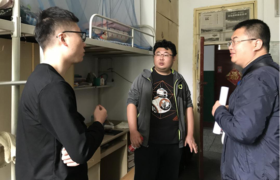 走进研究生宿舍,赵海涛副书记详细询问了同学们的科研学习情况、宿舍搬迁后生活环境的适应情况以及2017级研究生的就业情况。在与员工的交谈中,老师们还提醒研究生要增强安全防范意识,确保人身财物安全,并嘱咐大家要注意注意作息规律,锻炼身体,严格要求自己,以积极的心态和良好的面貌面对校园生活。谈话在欢声笑语中进行,气氛十分融洽,一声声关心与问候,让同学们倍感亲切。