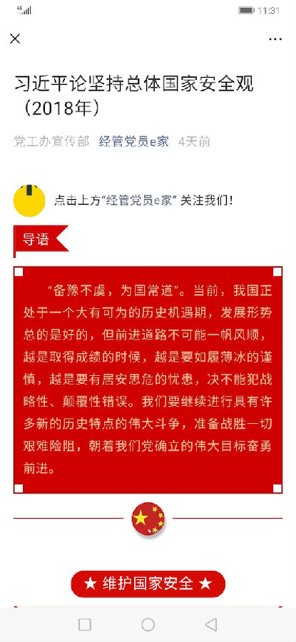 根据公司党委宣传部发布的《习近平论坚持总体国家安全观(2018年)》有关内容,4月15日,经济管理公司党建微信公众号“经管党员e家”制作了一期专题推送,旨在使师生深入学习贯彻习近平总体国家安全观,营造良好学习氛围。