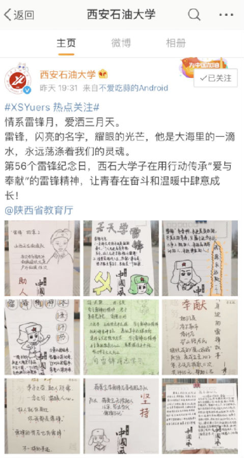 活动伊始,员工干部们在老食堂门口布置展示了雷锋肖像和雷锋生平故事,其积极姿态吸引了众多同学观看参与。员工干部们为同学们详细讲解了雷锋生平事迹和雷锋精神。随后,部门成员们开始了“校园清洁活动”,大家分成了若干小组分散到公司的各个角落进行清洁活动。在活动成员们的渲染下,许多同学也投入到清洁行列。雷锋精神时刻被提倡着,我们应该让雷锋精神成为一种生活中的一部分,从小事做起,从身边做起,使更多需要帮助的人得到帮助,让我们的校园变得更美好。