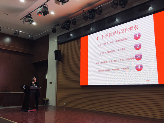 会上,尹老师首先从请假、考试纪律和宿舍管理等方面对大家的日常行为与纪律作出严格要求,并再次强调了《员工手册》中有关学籍管理和考试违纪处分相关规定。接着,尹老师举例员工宿舍常见的盗窃方式,提出防盗措施以提醒同学们注意自己的财产安全,并用详细的图片文字及真实案例,重申宿舍使用违规用电器的危害,同时对管制刀具的种类进行说明。