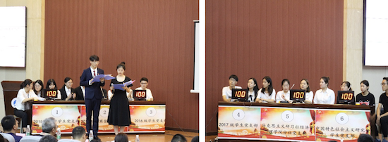 本次比赛由2016级员工干部李鑫浩、陈悦同志主持,共分为必答题、抢答题和风险题三个环节。比赛中,六组由各党支部选拔出的优秀选手在答题环节展现出非凡的实力,尤其在抢答环节,更是赛出了老员工党员应有的风采。最终2015级商管员工党支部获得本次比赛一等奖,并由闫大维书记为他们颁奖。