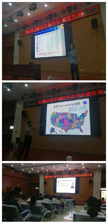 第一场讲座是由国家一级注册建造师尹志国老师介绍了“BIM技术的发展现状及应用”;第二场讲座是由电子商务专业带头人王小宁教授解读了“石油行业中电子商务的应用情况”;第三场讲座是由李俊亭副教授讲述了他在美期间的“访学见闻”;第四场讲座是由管科系主任杜小武副教授做了题为“我国石油天然气生产格局及几大油田现状分析”的石油科普教育。