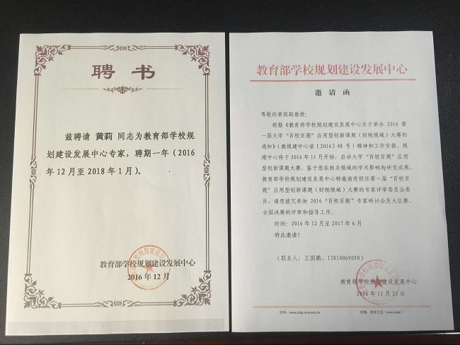 根据《教育部公司规划建设发展中心关于举办2016第一届大学“百校百题”应用型创新课题(财税领域)大赛的通知》(教规建中心函[2016]48号)精神和工作安排,2016年11月规建中心开始启动大学“百校百题”应用型创新课题大赛,鉴于公司黄莉副教授在相关领域的学术影响和研究成果,教育部公司规划建设发展中心特别聘请黄莉副教授为教育部公司规划建设发展中心专家。