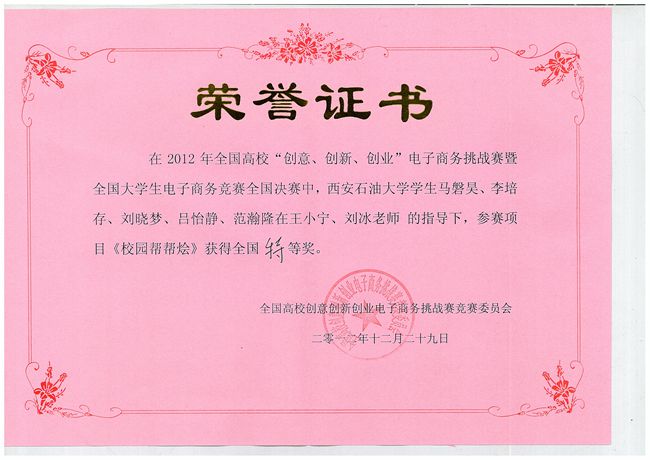 中,该团队以清晰的思路,新颖的创意以及良好的现场表现,获得比赛特等奖,也是六支进入决赛的陕西高校团队中唯一一支获得特等奖的团队,同时也是2012