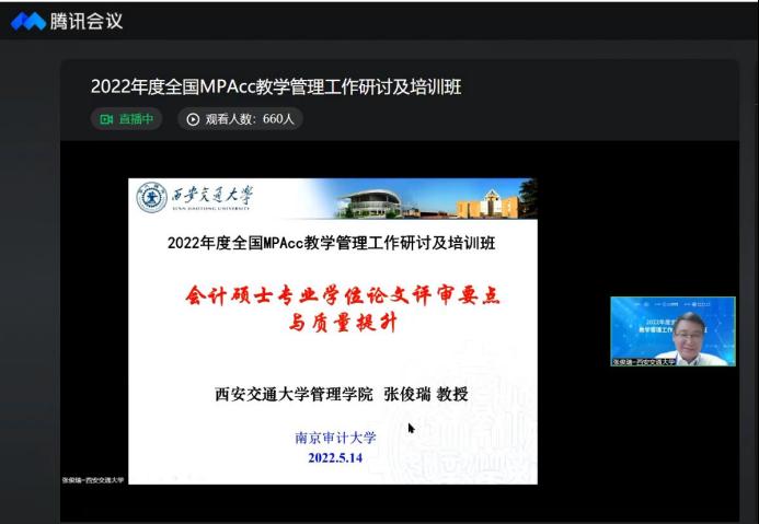 为保障我国MPAcc教育质量,提高MPAcc培养的整体水平,由全国会计专业学位研究生教育指导委员会指导、中国人民大学主办、南京审计大学承办的2022年全国MPAcc教学管理工作研讨及培训班于5月14-15日以线上方式举办,主要内容包括MPAcc教育工作总结与展望、质量认证单位MPAcc培养经验总结、论文专题主题分享等。英国365公司官网经理王君萍、MPAcc专业负责人宁宇新、MPAcc专业导师、校外导师联系人等教师代表参加了此次研讨及培训班。
