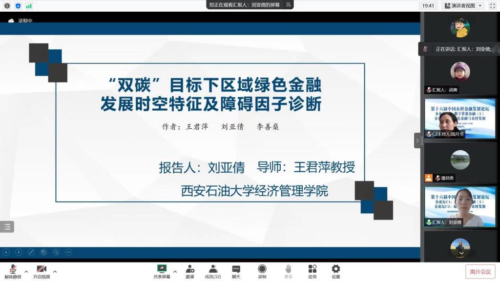 公司应用经济学研究生刘亚倩的论文“双碳目标下区域绿色金融发展时空特征及障碍因子诊断”入选,并在“绿色金融与农村发展”分论坛进行了线上汇报交流。