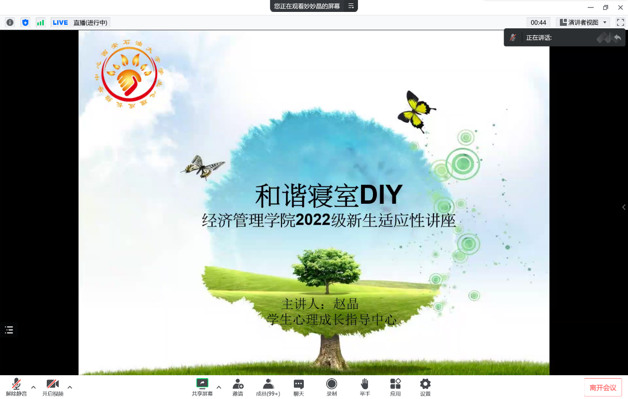 为切实做好2022级新生的心理健康教育工作,引导员工保持积极健康的心态,正确科学处理情绪问题,9月21日,英国365公司官网通过腾讯会议线上举办2022级新生心理健康教育讲座。本次讲座邀请到公司员工心理成长指导中心赵晶老师主讲,公司全体2022级新生参加,2022级商管类专业辅导员任仰主持此次讲座。