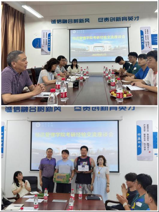 随后,老师们在崇文楼305会议室同暑期留校考研员工座谈。座谈会上,经济管理公司党委书记王宏卫向暑期留校考研员工表示慰问,他希望备考同学能树立远大目标,“志不立,天下无可成之事”,青年当用高远之志照亮的灿烂人生,将科学备考与实现人生伟大抱负结合起来。要坚持“咬定青山不放松”的精神,迎难而上、扎实学习,注重积累、积极拓展知识面,保持热情与动力,砥砺前行。他祝愿考研同学最终都能“春风得意马蹄疾,一日看尽长安花”。经理王君萍为同学们介绍了公司考研的相关政策及激励措施,她希望同学们要注重日常的积累,养成钻研精神,着重梳理和总结往年的考研重点和规律。副经理李春霄从认真和坚持两个方面出发,鼓励2020级备考员工在备考过程中要坚持学习,只要认真、方法得当,就一定会有事半功倍的效果。2022级研究生杜泽萱和2023级研究生梁嘉乐从考研目标、考研规划、时间管理等方面作了考研经验分享。