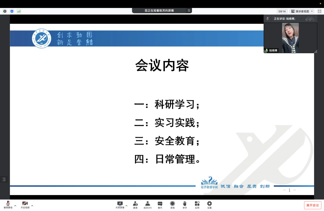 本次会议围绕科研学习、实习实践、安全教育、日常管理四个方面展开,涉及员工学习生活的方方面面。陆晓寒老师指出,研二的专业课程安排较少,课业压力较轻,同学们日常时间安排更加自主化,也更需要考虑生涯规划,以便对日后的择业或深造打好坚实基础。陆老师提醒同学们尽早与导师沟通,预计本年度11月中下旬会进行毕业论文的开题答辩,要高度重视做好毕业论文的选题工作,并强调,安全问题是研究生日常生活的首要问题,从宿舍安全、交通安全及防诈骗等几个方面进行了安全教育,明确要求宿舍内严禁使用大功率违规电器,日常外出要注意交通安全,选择更规范、更安全的出行方式,防范各类诈骗,警钟长鸣。最后,陆晓寒老师解释了研究生请销假审批制度,强调同学们在请假、实习时一定要先与导师做好沟通,方可提交请假申请,外出实习时要注意人身安全。