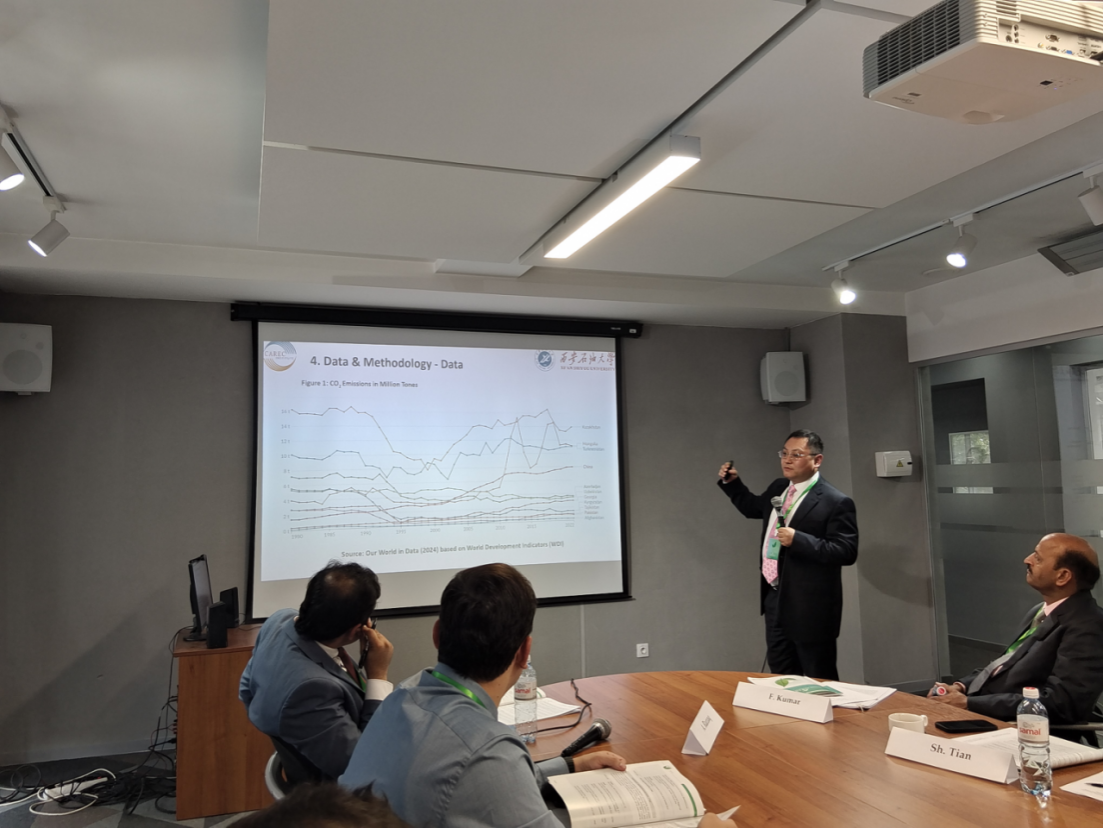 在“绿色创新、气候与环境”平行论坛中,陈丁做题为《Dynamic connectedness between FDI, economic activity, energy consumption and CO2 emissions in Central Asia Regional Economic Cooperation (CAREC) countries: The mediating role of institutional quality》的论文汇报。该论文基于CAREC各国2000年至2022年数据,研究分析了碳排放与外国直接投资(FDI)、经济活动、能源消费间关系,并在此基础上进一步探讨了制度质量对碳排放与FDI关系的调节效果。亚洲开发银行高级经济学家Grace Tian,以及中亚区域经济合作研究院高级分析师Asif Razzaq对论文选题和内容给予肯定,并提出“更加聚焦绿色FDI”等建议。