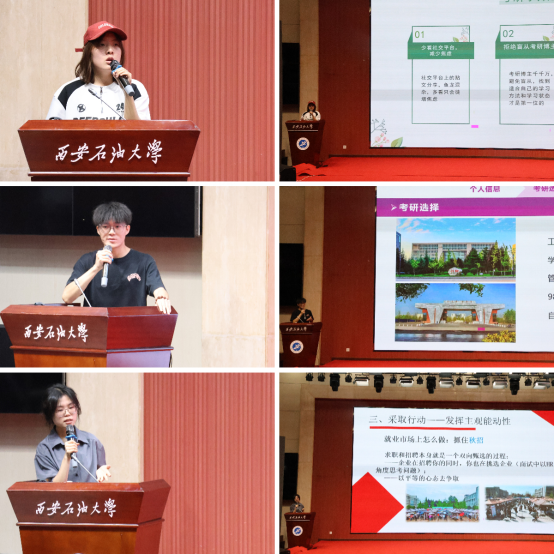 2021级优秀员工代表金倩茹、荣崇、李亚菲依次做考研、就业经验分享。他们结合自身经历,从目标确立、时间规划、复习策略、信息搜集、心态调整到简历制作、面试技巧、实习选择、offer决策等多个维度,与同学们展开分享交流,为同学们提供实战心得。