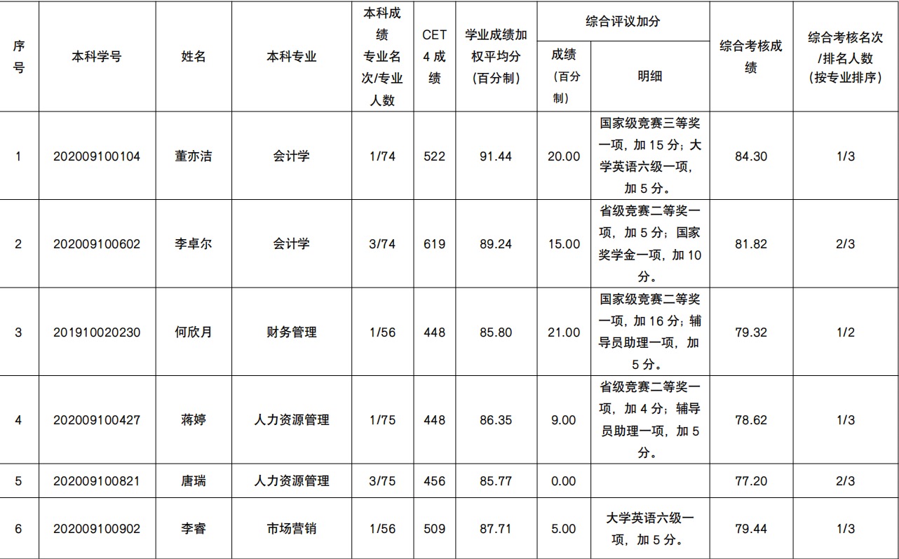 指标分配原则:2024年推免公司下达公司的推免生指标数12人,公司根据2024届本科毕业生专业人数分布情况,会计、人力两个专业各分配2人,其他6个专业各分配1人,剩余2个指标在除会计、人力之外的6个专业的第二名人选中按照综合考核成绩从高到低确定了各专业2024年推荐指标。